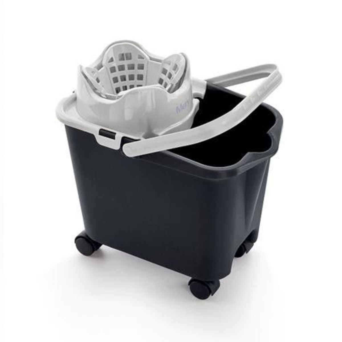 Cubo de fregona con sistema de escurrido sencillo y práctico, con ruedas para facilitar su transporte. Capacidad de 14 litros y diseño en color gris.