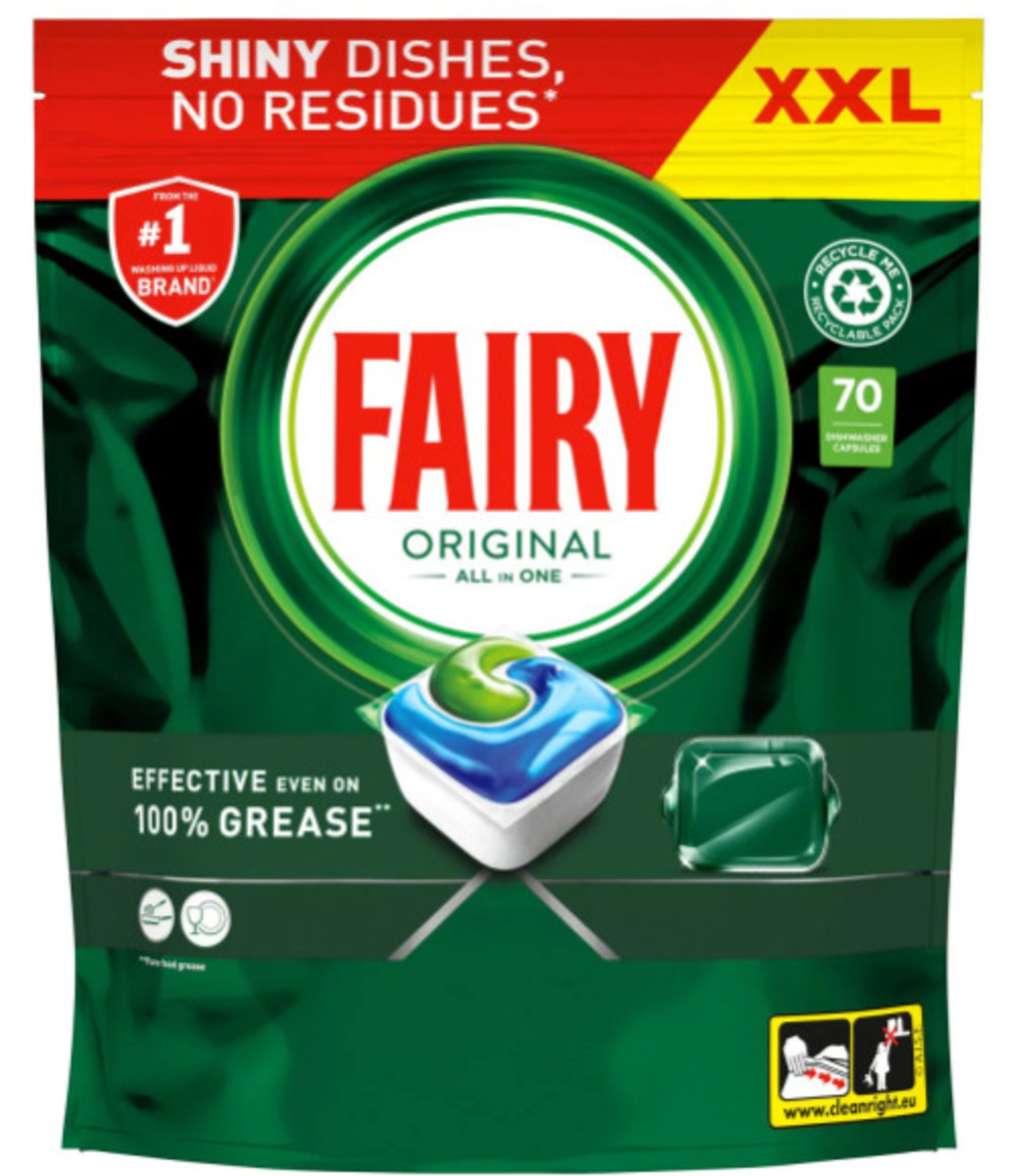 Fairy Original 70 Cápsulas All In One es la solución perfecta para mantener tu vajilla impecable y libre de grasa. Estas cápsulas de detergente para lavavajillas están diseñadas para ofrecer un rendimiento excepcional, eliminando incluso las manchas más difíciles y dejando tus platos, vasos y utensilios relucientes. Con su fórmula avanzada, cada cápsula proporciona una limpieza profunda y un brillo duradero, haciendo que el lavado de los platos sea una tarea rápida y eficiente.