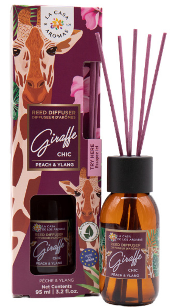 Descubre el Mikado Giraffe Chic de 95 ml, una fragancia exquisita que combina la dulzura del melocotón con la sofisticación del ylang-ylang. Este ambientador no solo perfuma tu espacio, sino que también añade un toque de elegancia a tu decoración. Su diseño moderno y atractivo lo convierte en un elemento decorativo ideal para cualquier habitación, mientras que su aroma envolvente crea un ambiente acogedor y relajante.