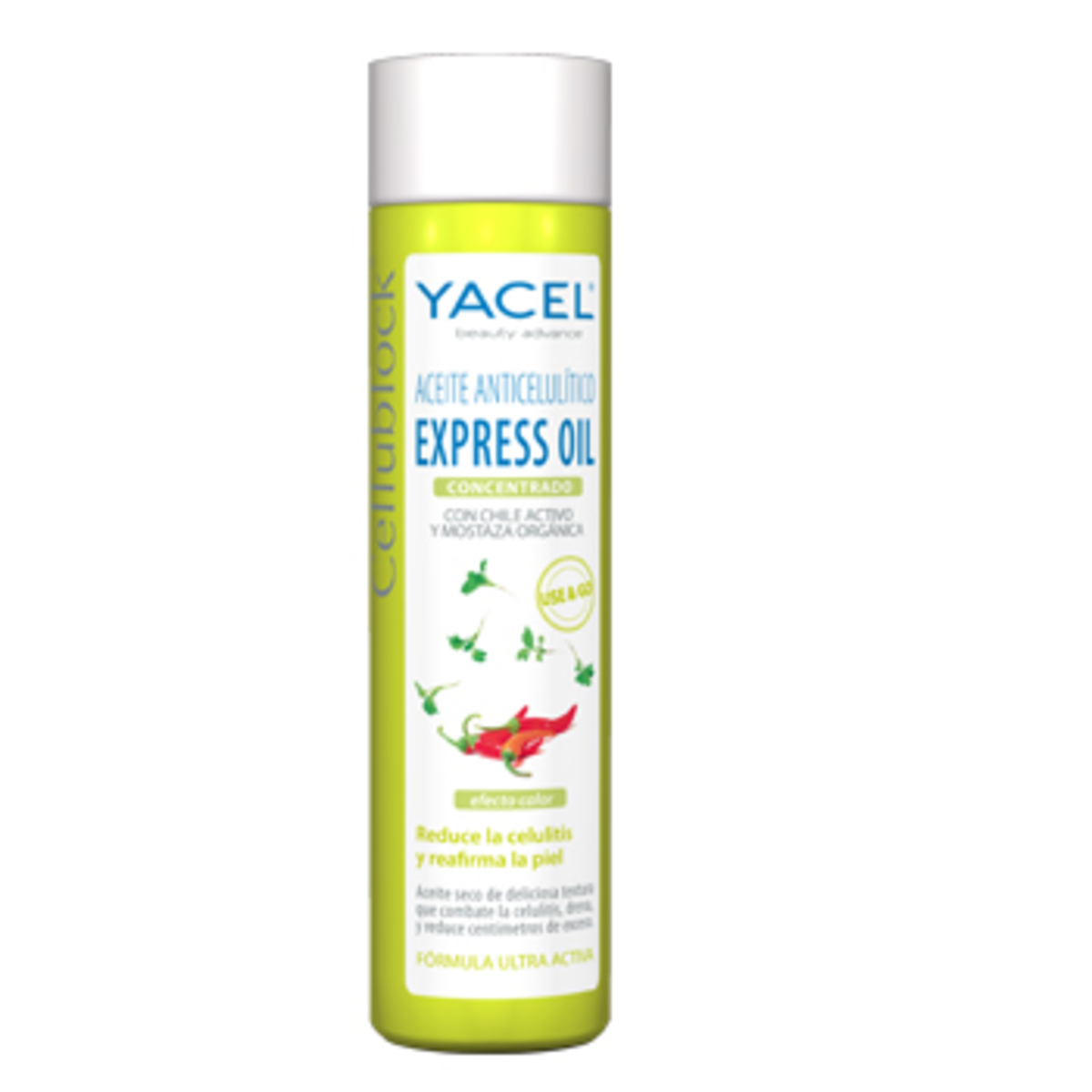 Aceite anticelulítico exprés formulado con Activos Picantes Combate la celulitis Drena y reduce centímetros de exceso Deja la piel flexible hidratada al instante, gracias a la mezcla TOP4 de aceites naturales.