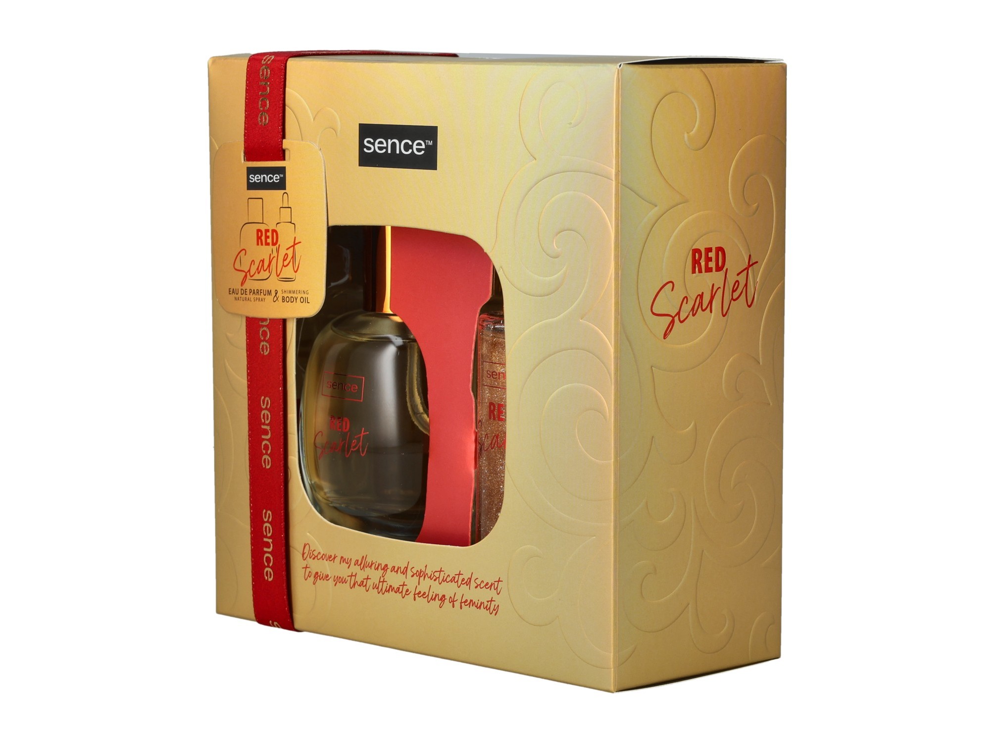 Kosmetikpaket, das ein Haarfärbe- oder Pflegeprodukt in scharlachrotem Farbton von 90 ml und ein Körperöl von 50 ml kombiniert.