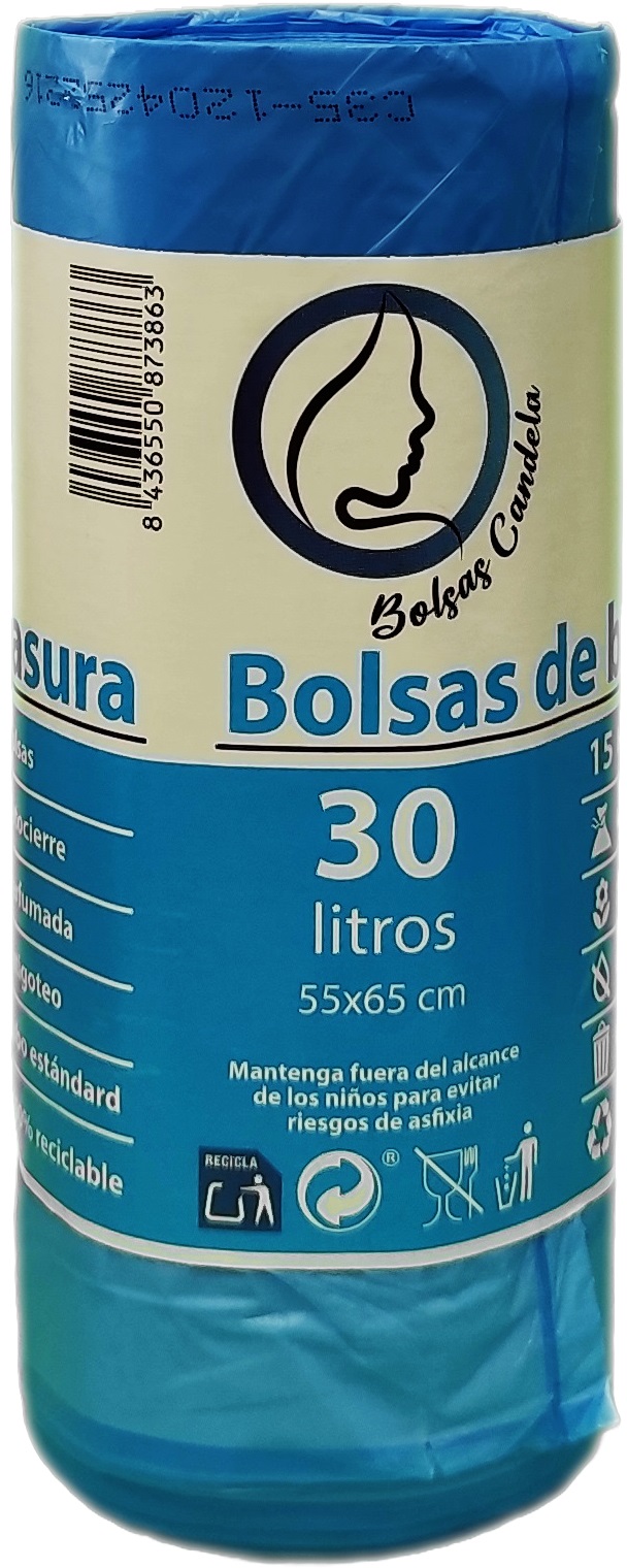 - Blauwe vuilniszakken met een geschatte capaciteit van 30 L, ideaal voor standaard keuken- en kantoormanden.